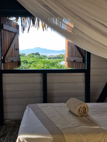 Un second espace extérieur sous la tonnelle avec vue sur le lagon aux eaux turquoises, une chambre Robinson en bois esprit cabane avec 2 lits simples, moustiquaires et ventilateur mural.