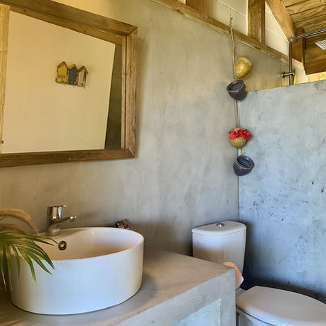 Coté jardin une seconde salle de bains avec wc à l' ambiance tropicale est adossée au bungalow.