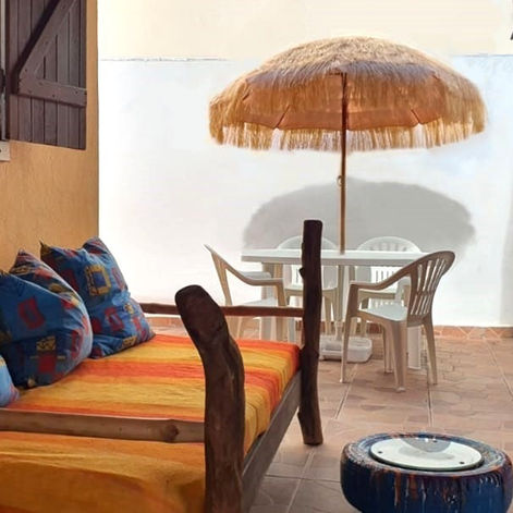 A l’extérieur un espace repas avec vue sur mer, une douche pour les retours de plage, un BBQ, un coin hamac donnant sur la place fleurie.