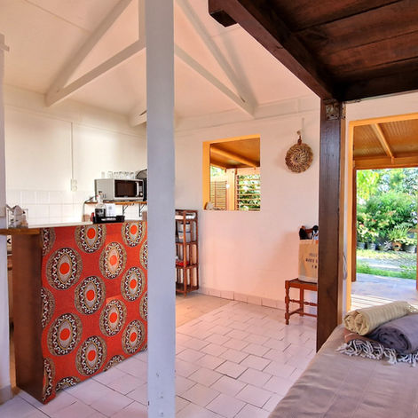 Kazamanlaure offre une pièce type studio et peut recevoir un couple avec deux enfants dans un espace familial commun, un lit en 140 et un lit mezzanine en 140 avec moustiquaire, ventilateur et climatiseur une kitchenette, une salle de bains avec wc.