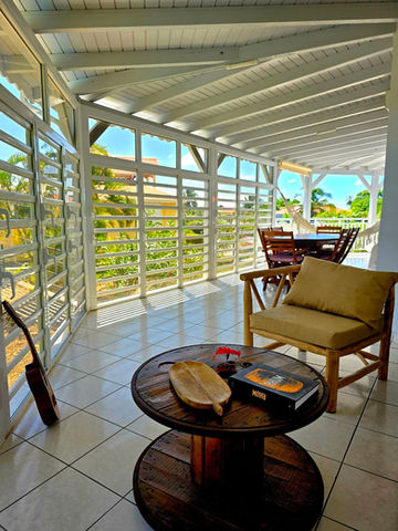 L'espace de vie s’organise autour d’une galerie de 50 m2 protégée de la pluie dans laquelle vous profiterez des douces soirées antillaises et du ti-punch offert à votre arrivée.