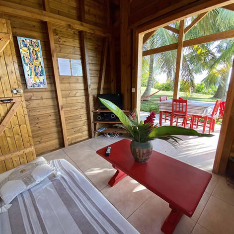 Vous pourrez profiter de la galerie avec son coin repas, son hamac et ses transats pour chiller devant le coucher de soleil.