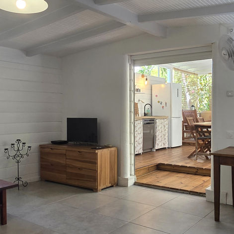 Le salon, ouvert sur la terrasse, vous propose un coin TV avec canapé convertible et un coin bureau avec WIFI.