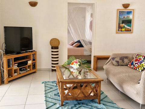 Le salon ouvert sur la terrasse et avec vue sur la piscine et le lagon des basses, vous permettra de profiter du coin TV tout équipé avec Box TV, chromecast et console de salon avec jeux.Par ailleurs, l’ensemble de la maison est connecté par la fibre et en wifi permettant si nécessaire le télétravail.